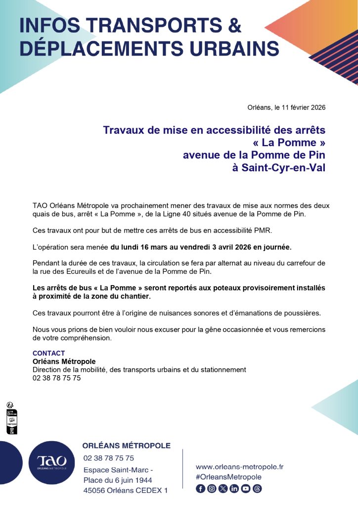Des travaux de mise en accessibilité des deux quais de bus de l’arrêt « La Pomme » (ligne 40), situés avenue de la Pomme de Pin à Saint-Cyr-en-Val, se dérouleront du lundi 16 mars au vendredi 3 avril 2026, en journée .